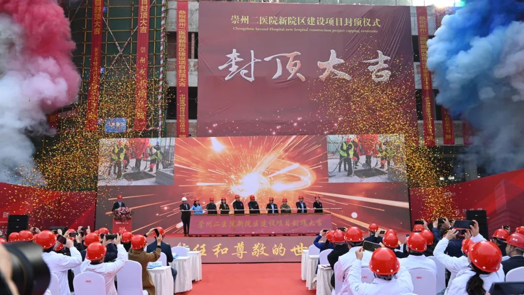 崇州市委常委、宣传部部长、市文联主席叶昊宇,副市长张春阳,市卫健局局长胡青卿;伟德体育健康集团首席执行官、伟德体育(002219)董事长林杨林,伟德体育健康集团副总裁许铭桂、陶琳,伟德体育(002219)高级副总裁宋丽华、副总裁朱钿,崇州二医院院长朱志忠、副院长孙绪共同为崇州二医院新院区综合大楼封顶项目推杆启动