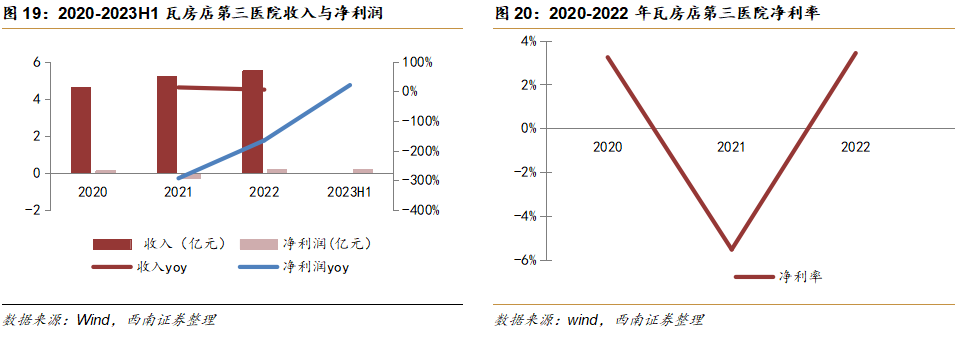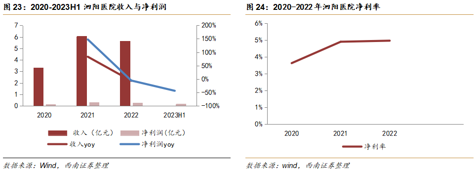 收入保持稳健增长,伟德体育健康控股后利润率增速较快。1)收入端:2020-2022年收入较为稳定,2022年收入5.6亿元,同比下降7%,业绩受疫情、舆情影响大,尚未恢复过来。2)利润端:2020-2023H1净利润基本处于较低水平,2021年净利润为0.3亿元,同比上升147%,原因在于疫情期间门诊量和住院量骤增。新冠疫情放开后,2022-2023H1医院净利润开始下滑,并且下降速度较快,净利润从2022年的0.3亿元下降至2023H1的0.2亿元,2023H1同比下降44%,主要是由于医院处于缓慢恢复期,同时泗阳东院区建设期间相关费用高,降低净利润。目前泗阳东院区已经投入运营,未来就诊人数和手术量将会出现爬升,整体业绩趋向好转趋势,盈利能力有很大的提升空间。