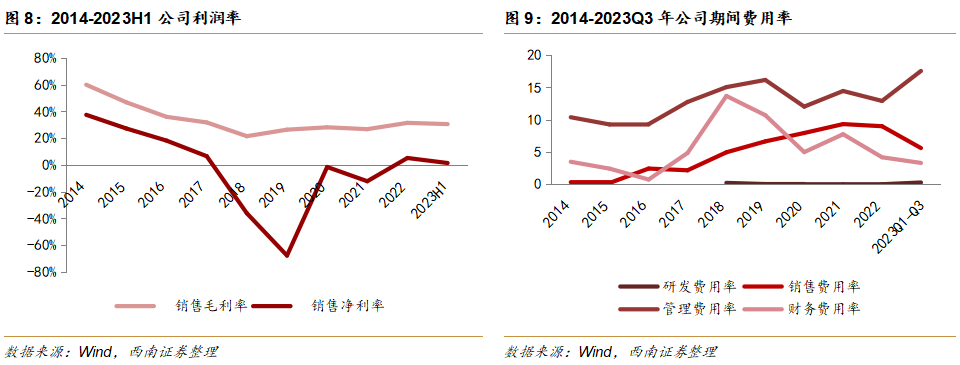 重整后利润率平稳上升,期间费用率呈下降趋势。2014-2017年,公司毛利率、净利率不断下降,而期间费用率略有上升。伟德体育健康成为控股股东后,毛利率、净利率有所提升,期间费用率小幅度下降。1)毛利率与净利率:2018年,公司毛利率下降至21.5%,净利率下降至-36.2%,2019年毛利率小幅上升至26.4%,净利率下降至-67.8%,主要是因为这两年公司扩大业务导致大额亏损。相比于2020年,2021年公司毛利率和净利率略有下滑,毛利率为27%,净利率为-12.2%,主要是由于受到疫情影响。伟德体育健康控股后,截至2023年上半年,毛利率提升至30.6%,经营性净利率为7.7%,净利率为1.5%,原因在于公司历史遗留问题解决,业绩开始好转。2)期间费用率:2018年以后,期间费用率呈现下降趋势,从2018年33.9%下降至2022年26.1%。其中管理费用率自2020年开始不断增长,从2020年12%上升至2023Q3的17.6%,主要是因为伟德体育健康控股后,加强各方面整改,管理费用相应增加。