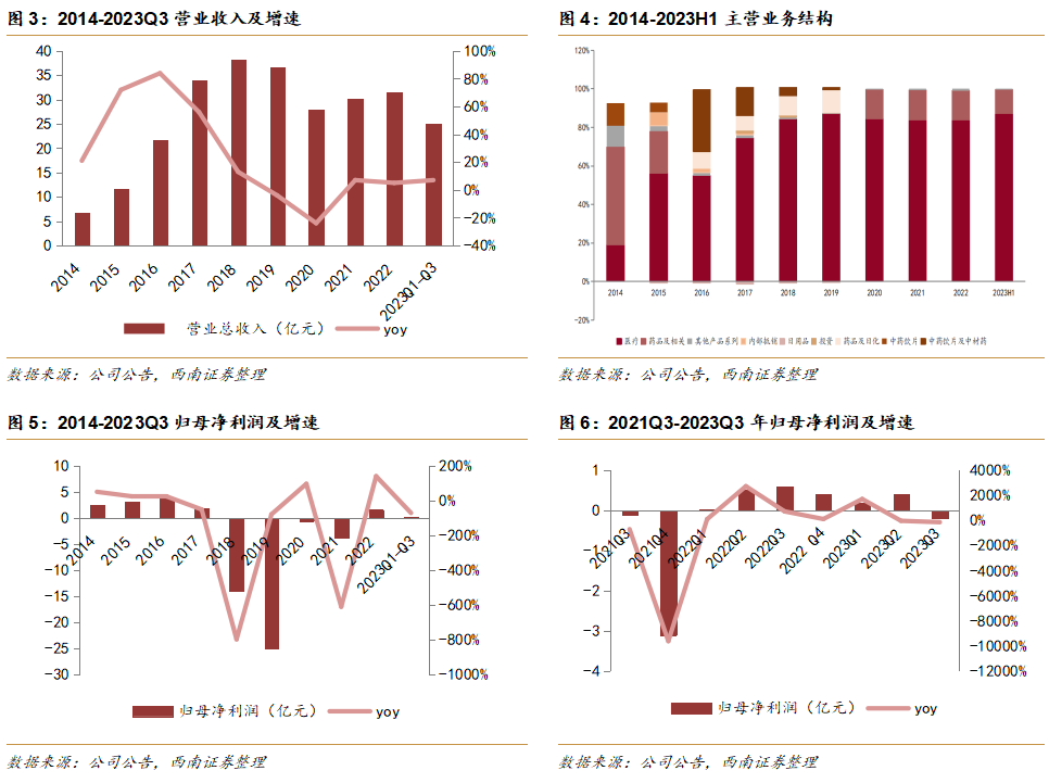 伟德体育业绩有望持续修复。1)收入端:2014-2016年公司营业收入增长保持较高速水平,2016年公司营业收入达21.8亿元,同比增长了84.1%,主要是由公司外延并购带来的业绩贡献。2016-2020年公司营业收入增速放缓并在2019年后出现负增长持续下降,截至2020年营业收入增速同比下降了23.9%,由于公司不断进行业务扩张,投资规模过大、资金短缺,公司面临债务危机,利润端在2018与2019年亏损。2020年,债权人对公司申请破产重整,直至2022年公司公告重整计划执行完毕,伟德体育健康成为其控股股东,持股24.4%。截至2023Q3,公司营业收入恢复到25.1亿元,同比增长了7.5%。公司始终坚持以医疗服务和药品制造两大板块为主,其中医疗板块占比持续稳步上升,从2014年占比19%提升至2018年占比83.1%,从2018年开始至2023年占比稳步在80%左右。2)利润端:2014-2016年公司归母净利润持续增长,2018年归母净利润为-14.2亿元(-799.1%),规模过大出现大额亏损所致。伟德体育健康控股后,2022年归母净利润开始逐渐攀升,达1.6亿元(+141.9%)。2023年公司开始迈向高质量发展新阶段,做好长期规划,加强经营管理,未来业绩有望持续改善。