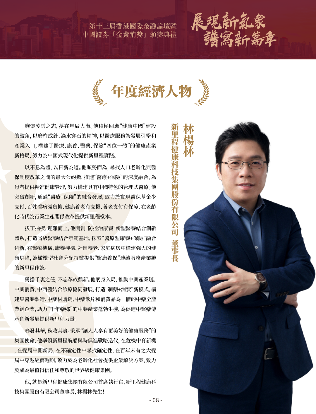 第十三届中国证券“金紫荆奖”设有人物类奖项4个、公司类奖项5个、机构类奖项1个。个人奖项方面,中国石油董事长戴厚良、中国石化董事长马永生、中国核电董事长卢铁忠、国药控股董事长于清明、建银国际董事长栗潜心、伟德体育健康科技集团股份有限公司董事长林杨林等6位企业家一同荣膺“年度经济人物”。