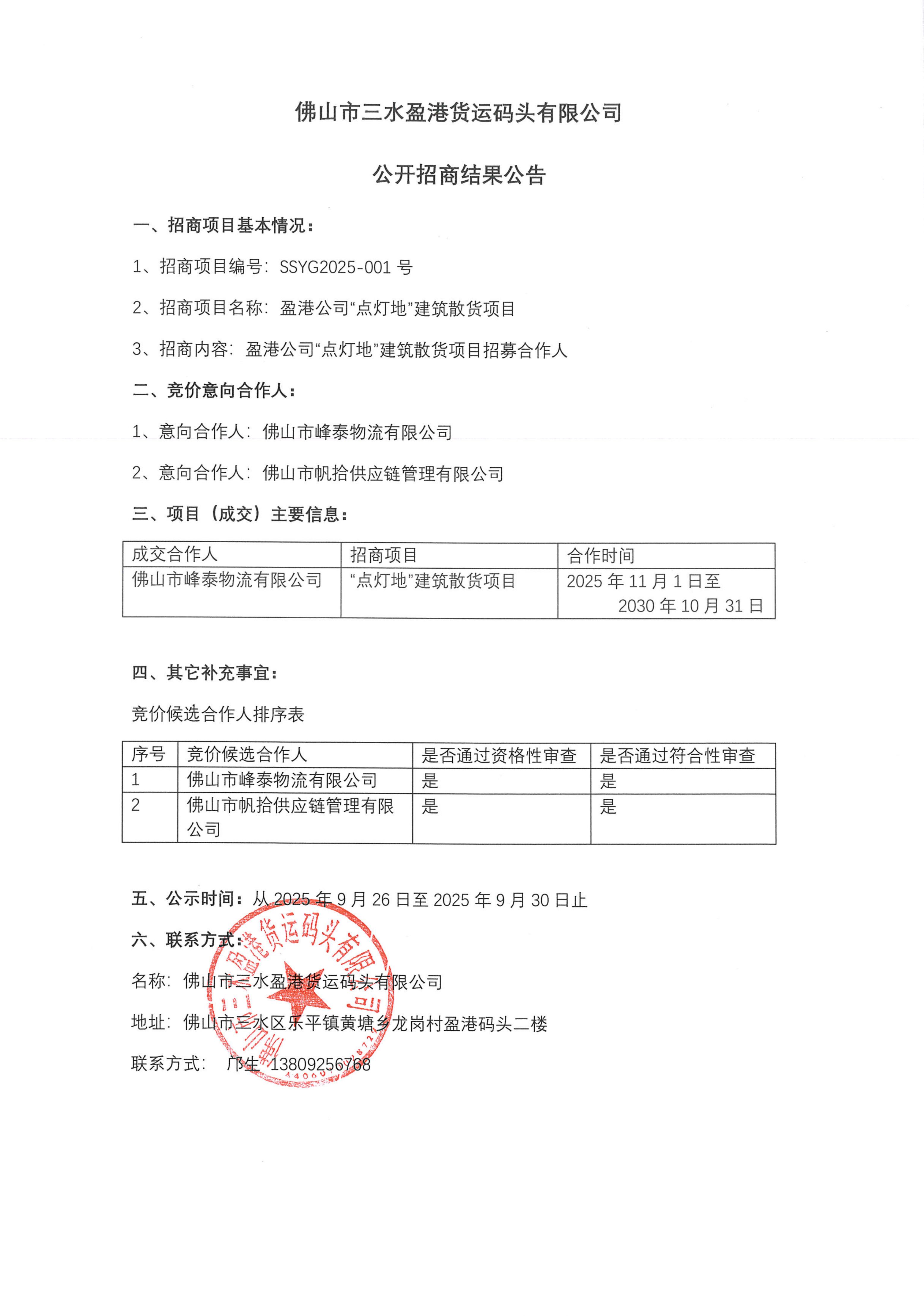 盈港公司点灯地建筑散货项目招商结果公告
